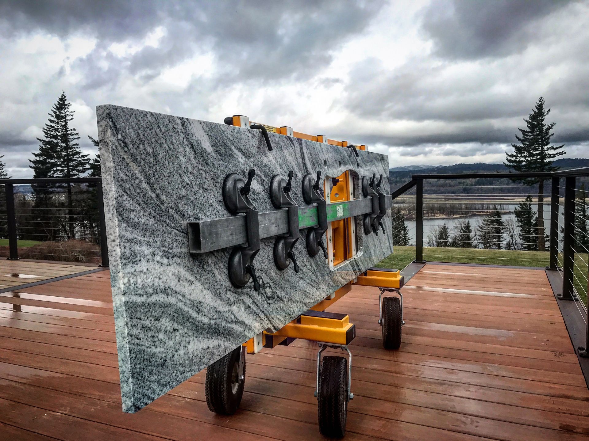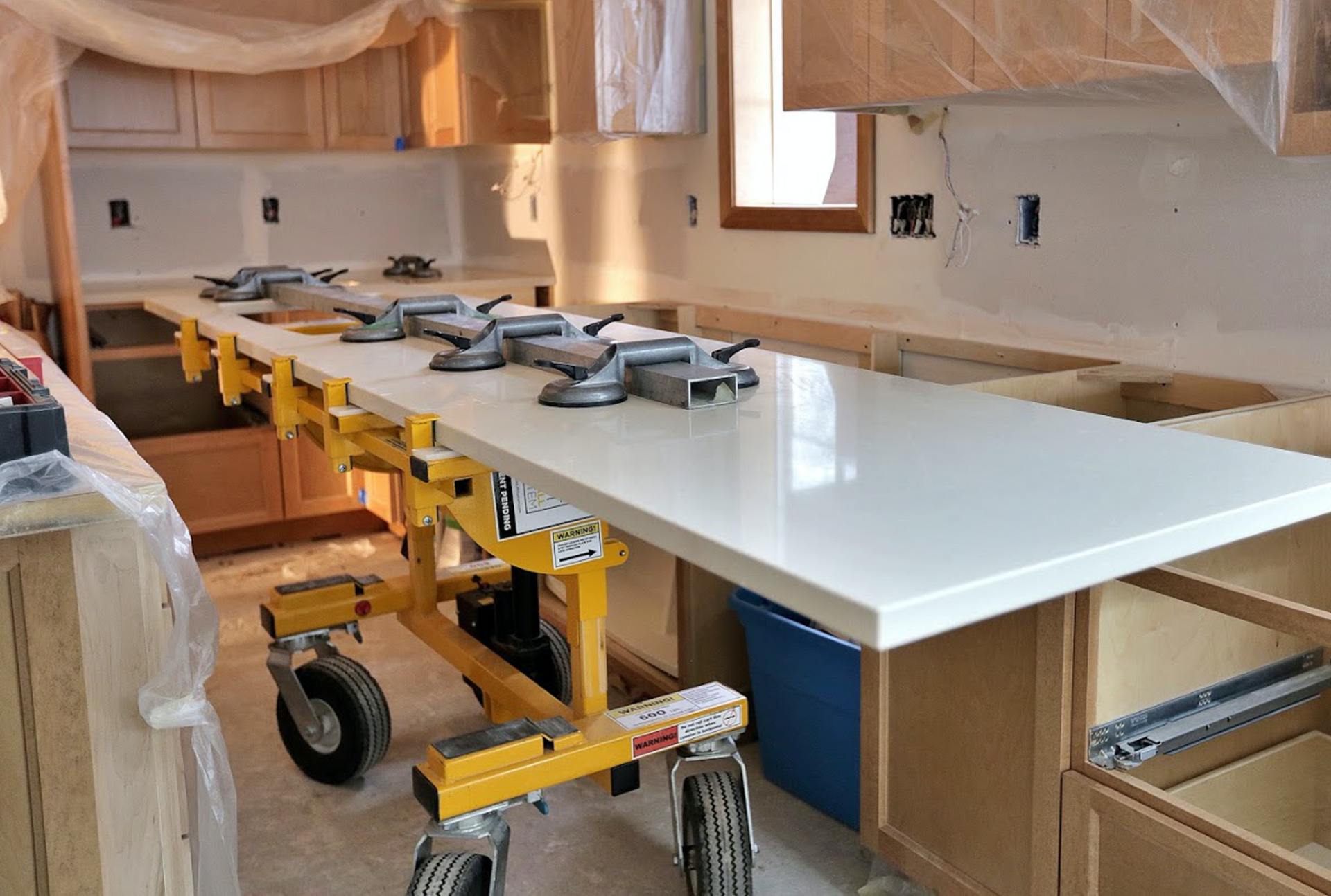 The award-winning "No Lift" is a revolutionary device for installing both granite and quartz countertops. It handles the heavy lifting and rotations, reducing the risk of injury and damage. This eliminates the need for extra help and ensures a safer, more efficient installation. The remote-controlled cart lifts counters to cabinet height and smoothly transfers them into place. The No Lift Install System brings the benefits of shop tools to installers on-site.